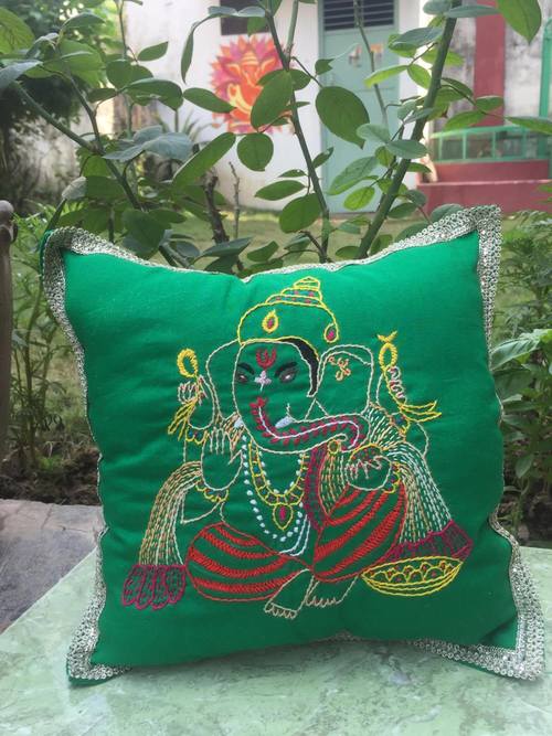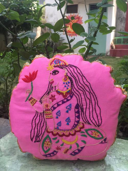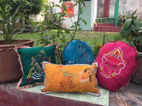 Each pillow is about 9 inches in width, although size slightly varies, and they are perfect for cuddling. Hand embroidered on various textiles from the Varanasi market, they make an unforgettable gift or keepsake.